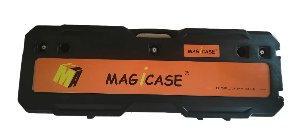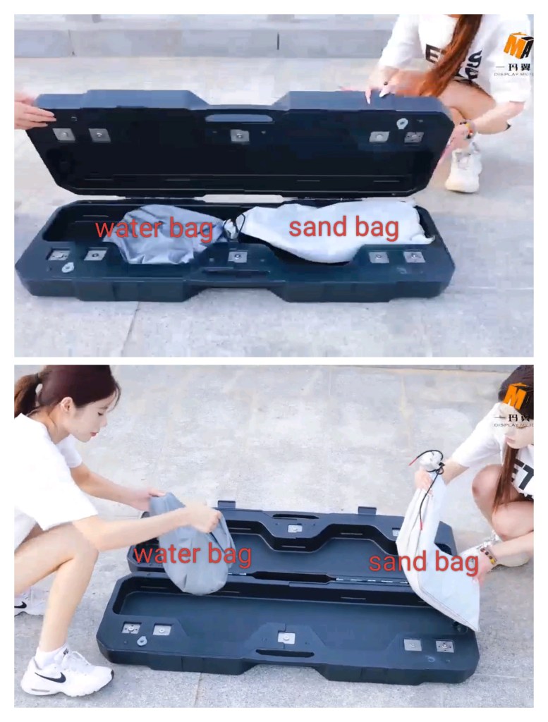 Material for Magicase itself is 10kg to ensure the wall-thickness.Water or sand bag can be added.With water or sand filled,the weight can be over 80kg.Reliable for outdoor display.